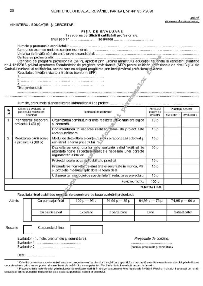 PROFESIONAL Metodologia de organizare și desfășurare a examenului de certificare a calificării profesionale pentru absolvenții învățământului profesional cu durata de 3 aniFIȘA DE EVALUARE